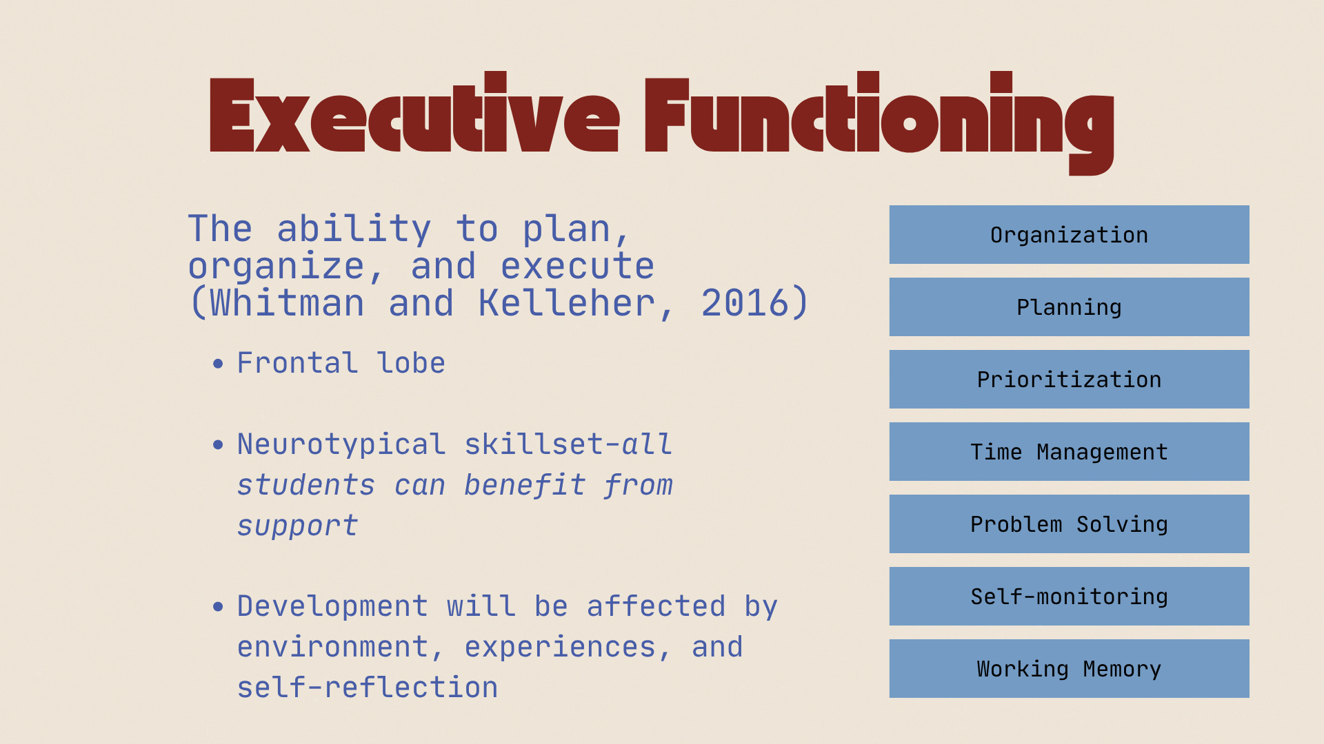 I presented to approximately 60 graduate students going into their second year of the program. From my personal experience, not all of them will have an interest in pediatrics or working in schools. As a result, I needed to make sure I provided a comprehensive, multifaceted viewpoint of the material, so that the information could be applied to a range of ages and populations.