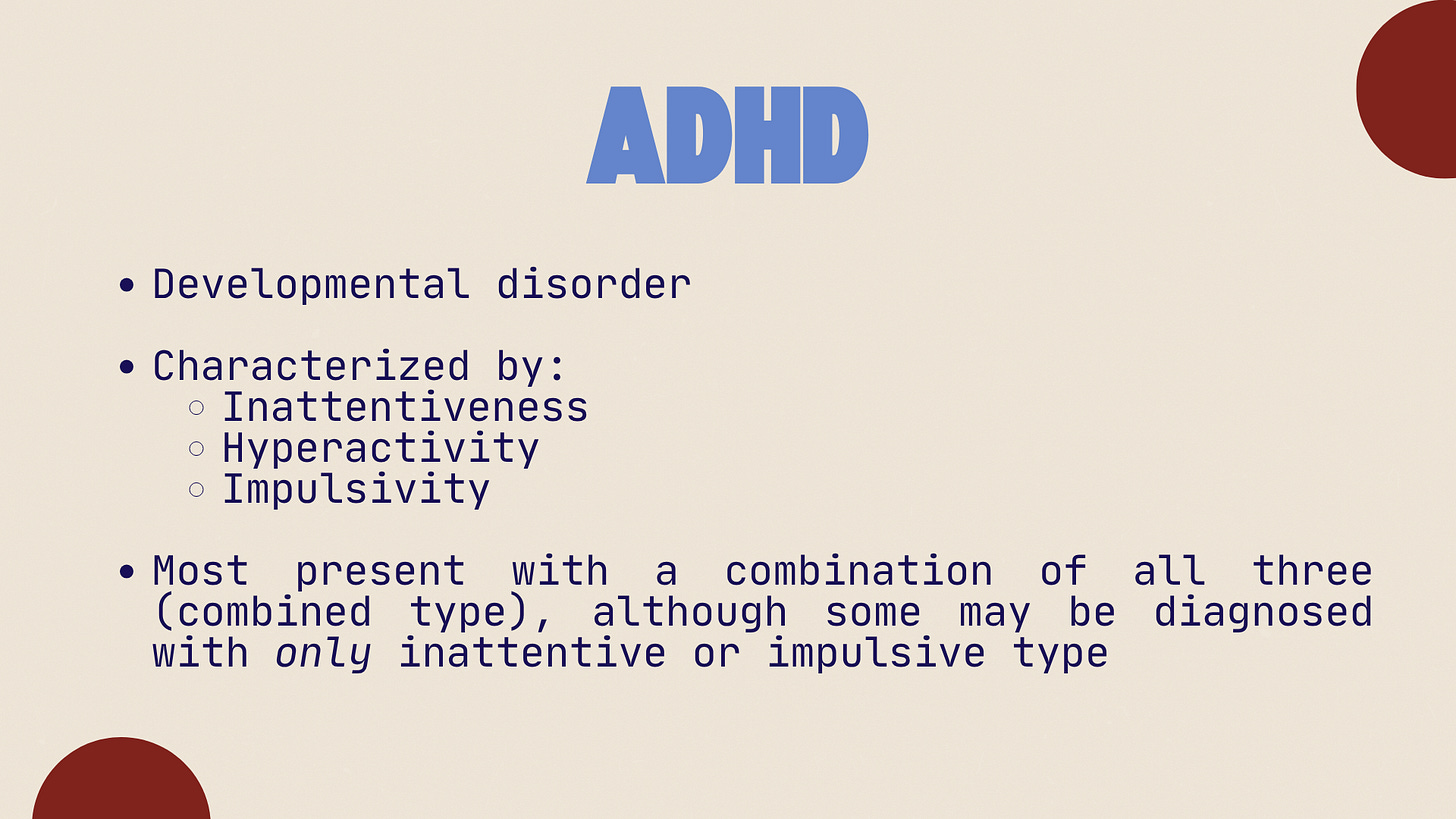 First, I outlined the various types of Attention Deficit Hyperactivity Disorder and described how they can present behaviorally in a classroom. I made it a point to mention that having a language-based learning disability does not reflect someone’s level of intelligence, and in fact many students can demonstrate significant talents and excel in their passions when given the right resources and agency.